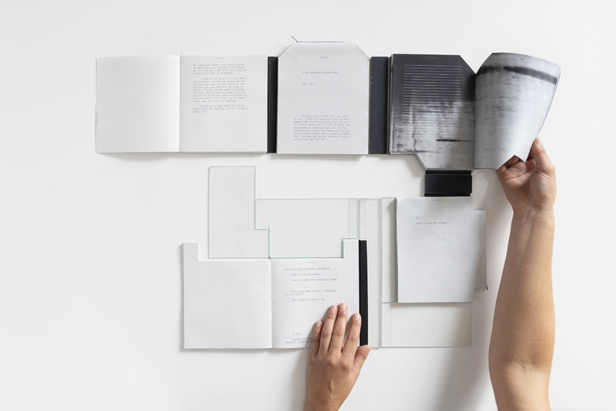 "(...)Once opened, this book-space can be unfolded further to reveal more of its interior. With each ‘page’ turned, the viewer proceeds further into the flat and is able to virtually access and discover the different rooms on the floor plan. This requires focus. The artist leads the viewer through the flat by allowing them to gradually identify the rooms’ various purposes: the common spaces, like the hallway, bathroom, and kitchen, are made of acrylic glass. The private rooms, on the other hand, are made of light grey or black cardboard. Besides differing dimensions and shapes, these surfaces or pages are also distinguished by different texts.