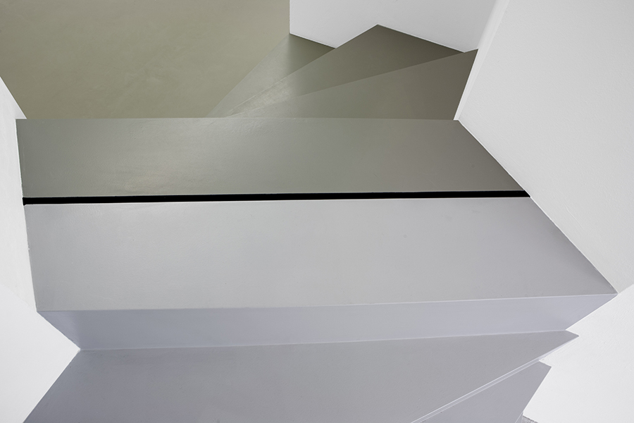 „In the passageway between two exhibition rooms of the Städtische Galerie Bremen, Effrosyni Kontogeorgou installed a staircase with three steps leading up out of the one room, immediately followed by three steps leading down into the next room. Although these two elements form a unified spatial object and (foreign) object, each is clearly marked by a slightly different grey tone that conforms to the colour of the floor in the room adjacent to it. The elements are also marked as separate by a narrow slit in the top step. The slit is painted black on the inside and thus indicates a border, a line, a space in between.The passageway, in which the staircase has been temporarily installed during the exhibition of the 40th Bremer Förderpreis für Bildende Kunst, only came to connect the two rooms in recent years, making a circular tour of the Städtische Galerie possible. It fits in with the building’s many curious architectural details that have grown, changed, and been altered over the years: because of irregular walls, it had to be installed with two diagonal bends. This causes the staircase to have a dizzying change of direction. The steps first taper off into this and then that direction. If I use the steps, I twist myself into and out of them again – a surreal movement. Using the installation feels appropriately playful, even if it is experienced as an obstacle because its architectural function seems meaningless for a moment. Visually the matched colours provide an apparently smooth transition, but the bodily experience of it is unsettling. The narrow, black slit in the middle gives one the impression of indeed crossing a threshold – a border between two different sections of a unit, between two mirrored parts. Effrosyni Kontogeorgou references the concept of ‘liminality’, a term used by the ethnographer and cultural anthropologist Victor Turner, who characterised it as a transitional state within a process of social detachment. This state is observable, for example, in initiation rites, with which human societies mark apparent transitions. Effrosyni Kontogeorgou took the crossing of the built-in staircase literally and titled the work Threshold. Accordingly, she recognises liminality also as spatial characteristic, creating and marking liminal spaces. (...)She goes beyond by marking the basic function of liminal spaces: the conscious crossing of borders, which in the most extreme case involves traversing levels of consciousness or the personality. In considering the small slit in the middle of the staircase, which can become a true chasm, an impassable line more than in just the physical sense, one sees how this simultaneously striking and subtle intervention necessitates and dictates a symbolic gesture, which is almost inevitably carried out respectfully and consciously by the participating visitors. Such an awareness of thresholds includes social aspects like ‘us over here’ and ‘them over there’ as well as mental categories in which the staircase’s opposite side becomes an Alice-esque verso through the looking-glass. (...)Effrosyni Kontogeorgou offers us a form of assimilation that can be a truly permanent revolution. Consciously choosing the liminal way.“
